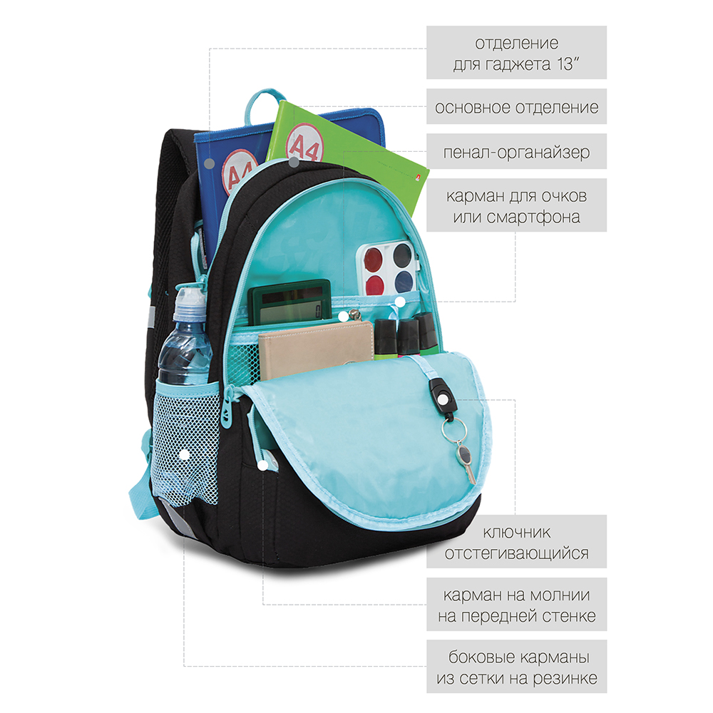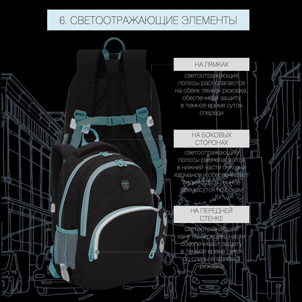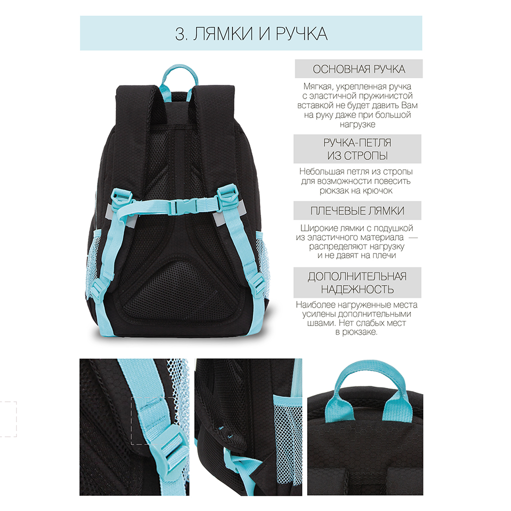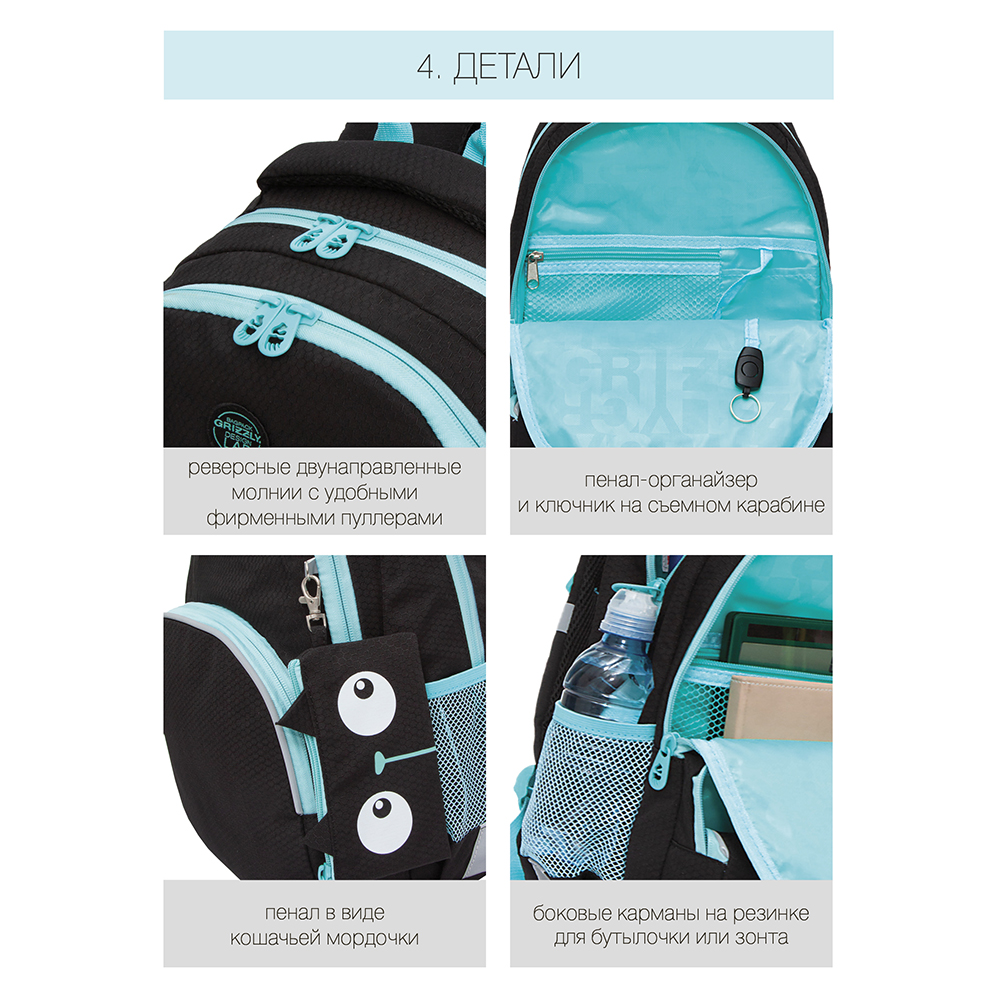Рюкзак разработан для учащихся начальной и средней школы. Анатомическая спинка, удобные лямки и нагрудная стяжка-фиксатор позволяют равномерно распределять нагрузку на спину и плечи. Материал рюкзака с водо- и грязеотталкивающей пропиткой. Рюкзак очень хорошо оснащен, имеет два вместительных отделения для учебных пособий форматом А4. В основном отделении есть карман для планшета или небольшого ноутбука 13". Дополнительное переднее отделение оснащено съемным держателем для ключей и тремя карманами. Двунаправленные реверсные молнии с брендированными пуллерами на замках позволяют легко открывать и закрывать рюкзак. У рюкзака внешний карман на молнии, удобная ручка для переноски, дополнительная ручка-петля и два боковых кармана для бутылочки с водой. Светоотражающие элементы с 4-х сторон обеспечивают дополнительную безопасность. К рюкзаку прилагается обучающая брошюра по программе «GRIZZLY Здоровая Спина».