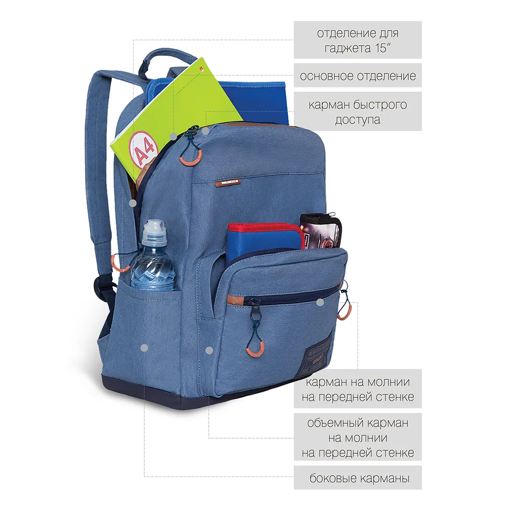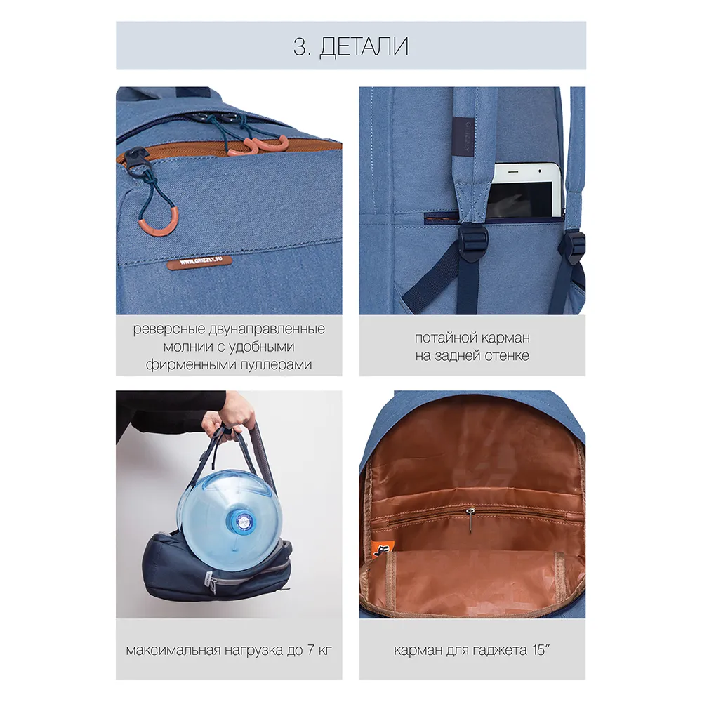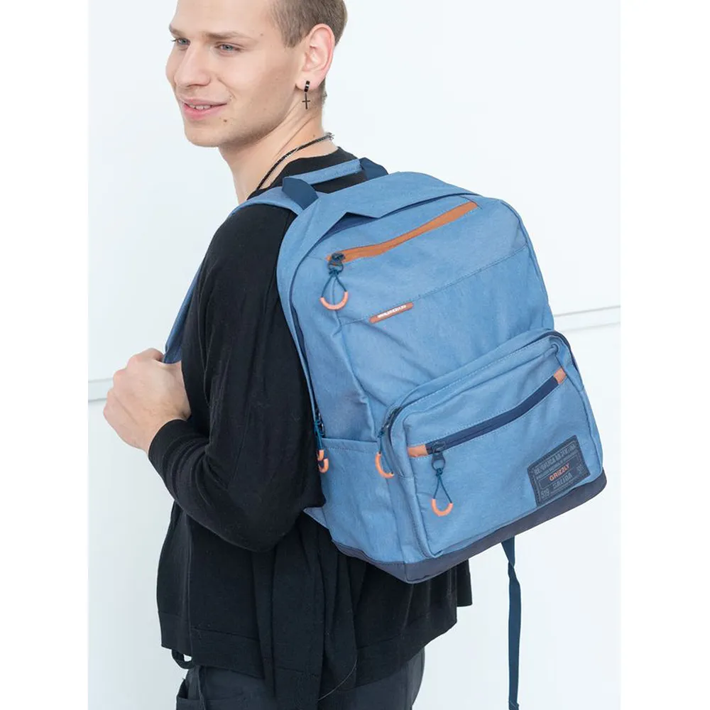 Стильный и легкий городской рюкзак GRIZZLY для прогулок и путешествий, отдыха и спорта, работы и магазина, школы и института. Этот эргономичный городской рюкзак продуман до мелочей. Он имеет одно вместительное основное отделение с карманом для планшета или небольшого ноутбука 15" и дополнительные карманы. Большой накладной карман спереди с дополнительным плоским карманом на молнии, карман быстрого доступа для мелочей в верхней части рюкзака с держателем для ключей на фастексе, секретный карман на молнии на спине, а также два боковых кармана. Рюкзак GRIZZLY имеет удобную укрепленную спинку, регулируемые мягкие лямки и ручку для переноски, обшитую тканью. Материал рюкзака с водо- и грязеотталкивающей пропиткой. Двунаправленные реверсные молнии с брендированными пуллерами на замках позволяют легко открывать и закрывать рюкзак. Рюкзак имеет прочную и грязеотталкивающую фирменную подкладку GRIZZLY.